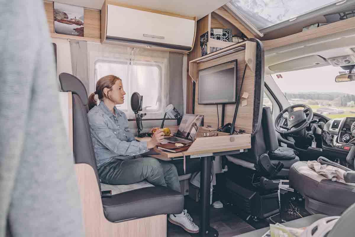 Die meisten Wohnmobile bieten durch drehbare Fahrer- und Beifahrersitze in Kombination mit dem Esstisch einen vollwertigen Arbeitsplatz. Die Sitzposition ist aufrechtes Arbeiten ausgelegt, und der Tisch bietet genug Fläche für Laptop, Maus und eine Tasse Kaffee.