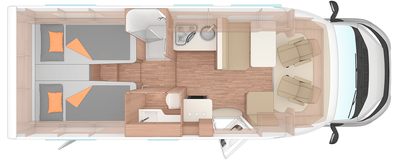 Vier feste Schlafplätze: Der CaraSuite bietet zwei separate Schlafbereiche: Ein festes Doppelbett im Heck (210 x 135/123 cm) und ein elektrisches Hubbett (192 x 140/120 cm), das bei Bedarf platzsparend in der Höhe verschwindet.